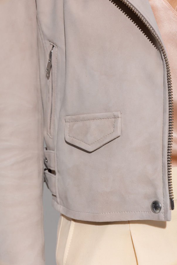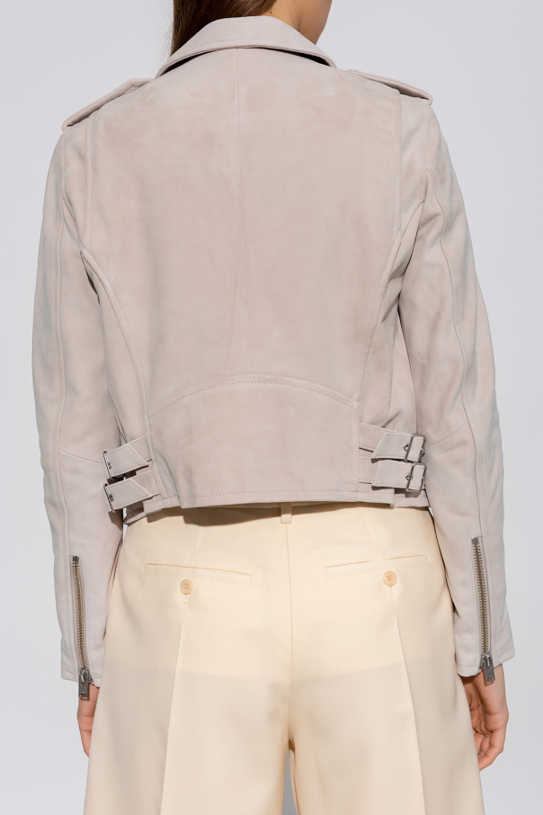 Greyish-beige ‘Ashley’ suede jacket from Iro. Crafted from lamb leather, this style features a zip fastening, snap-fastened shoulder epaulettes, two zip pockets, one snap-fastened pocket, decorative buckle tabs at the waist and long sleeves with zip vents on the cuffs.