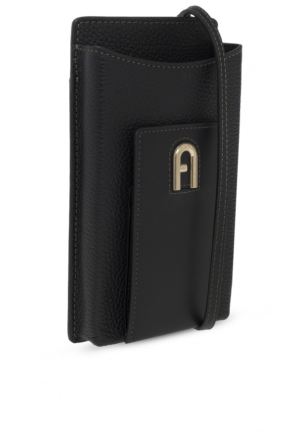 Black ‘Primula’ phone holder Furla. Made of leather, this model features a metal logo, four card slots with snap fastenings, back zip pocket, adjustable shoulder strap, one internal compartment and gold-tone metal hardware.