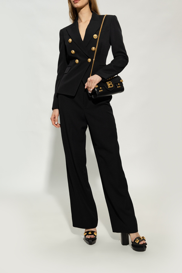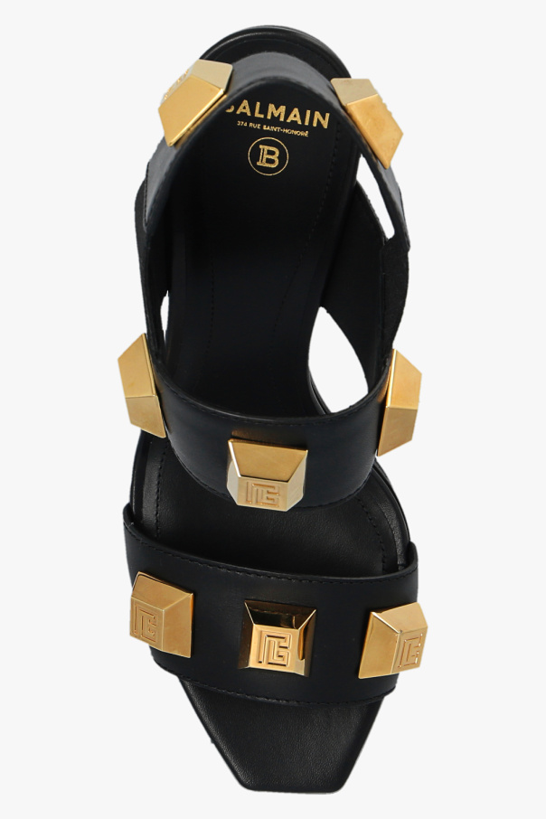 Black 'Ava' heeled sandals from Balmain. Crafted from calf leather, this model sits on a black leather sole and showcases an elasticized ankle and gold-tone applications with an embossed monogram.
