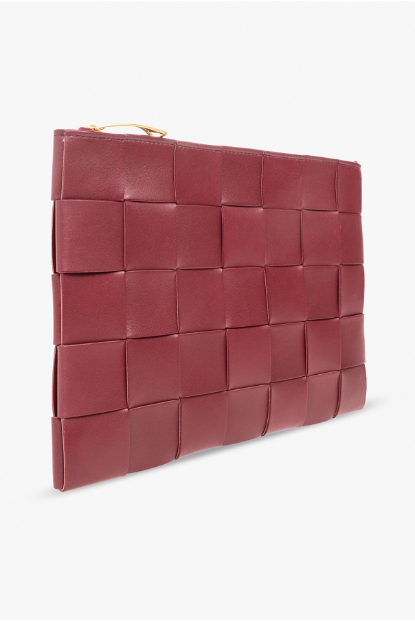 Maroon ‘Pouch Medium’ clutch from Bottega Veneta. Crafted from a blend of calf leather and lamb leather, this design showcases the brand\'s signature Intreccio weave. It is complete with a zip fastening, gold-tone metal hardware and one internal compartment with a slip pocket.