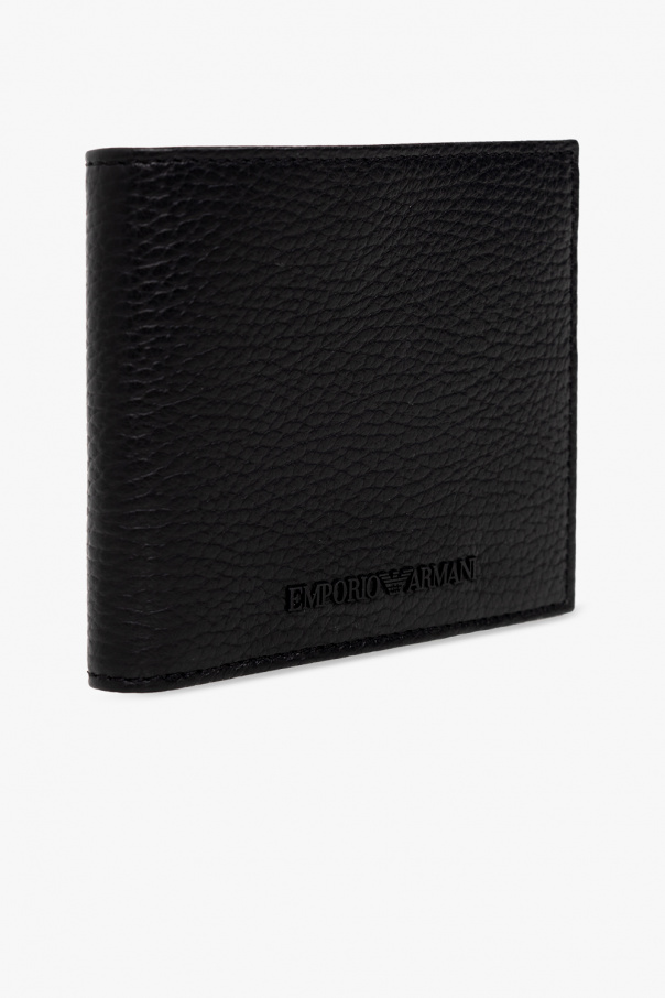 Black bifold wallet from Emporio Armani. Crafted from leather, this item features a raised logo and green lining. It has a bill compartment, two slip pockets and eight card slots.