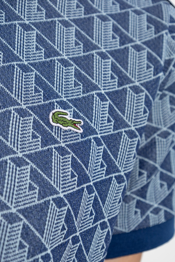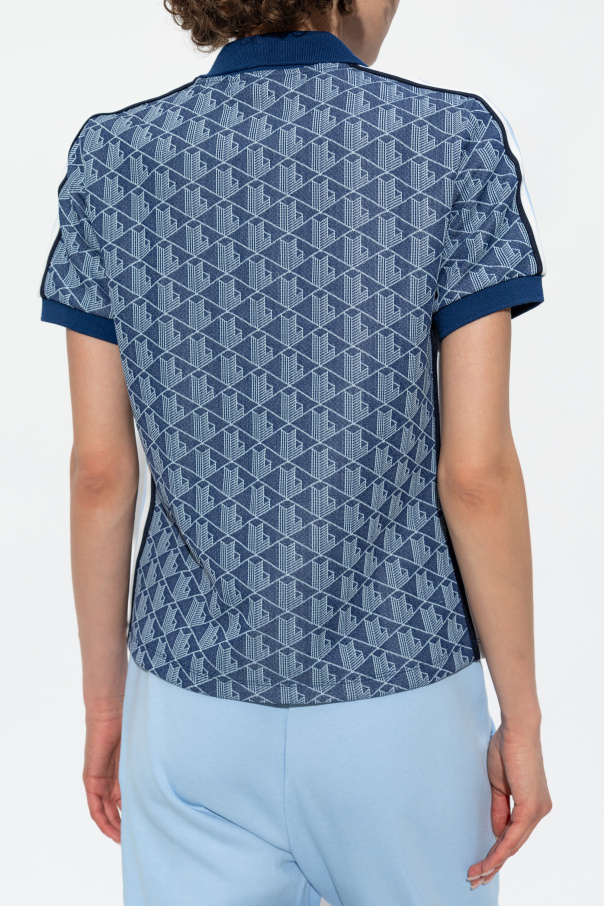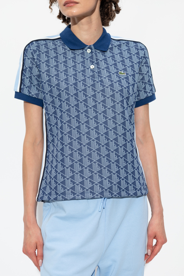 Introducing the Polo with Monogram from the exclusive collection by Lacoste. This exquisite piece, belonging to the WOMEN, CLOTHING, TOPS, T-SHIRTS, POLO category, epitomizes timeless elegance and sophisticated craftsmanship. Crafted from a luxurious blend of polyester, cotton, and polyamide, this blue polo exemplifies the high-quality materials renowned in exclusive collections. The classic polo design features short sleeves and a buttoned collar, offering a perfect blend of comfort and style. Adorned with a repeating monogram in a geometric pattern, the fabric showcases a subtle yet striking visual appeal. The left chest boasts the iconic embroidered crocodile logo, a hallmark of Lacoste\'s legacy. The sleeves and collar are accentuated with a darker blue finish, enhanced by chic white stripes on the shoulders, adding a touch of refinement. The polo\'s slightly tailored fit accentuates the silhouette, providing a flattering look. Versatile in nature, it pairs effortlessly with light blue sweatpants for a sporty ensemble or can be styled casually for everyday wear. Why Choose This Product? Exclusive Design: Features a sophisticated monogram pattern. High-Quality Materials: Made from a refined blend of polyester, cotton, and polyamide. Iconic Branding: Embroidered crocodile logo signifies timeless elegance. Versatile Styling: Complements both sporty and casual outfits. Elegant Detailing: Darker blue accents with white stripes on the shoulders.