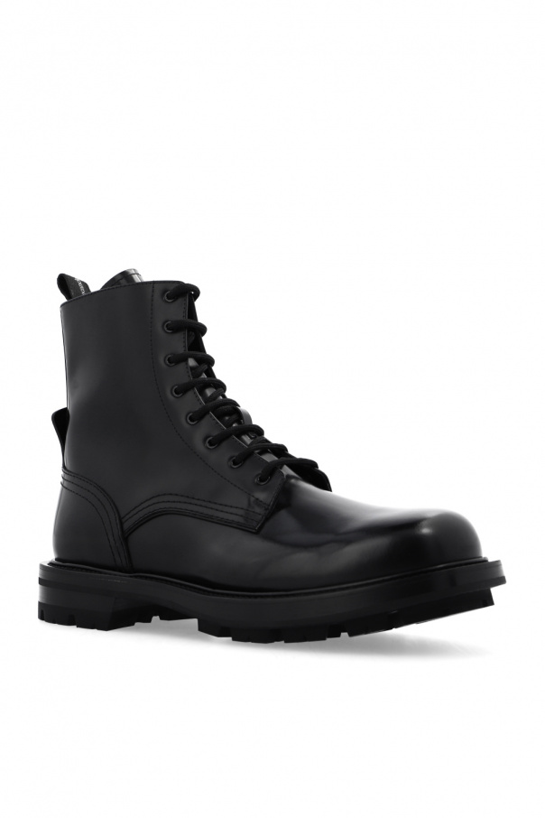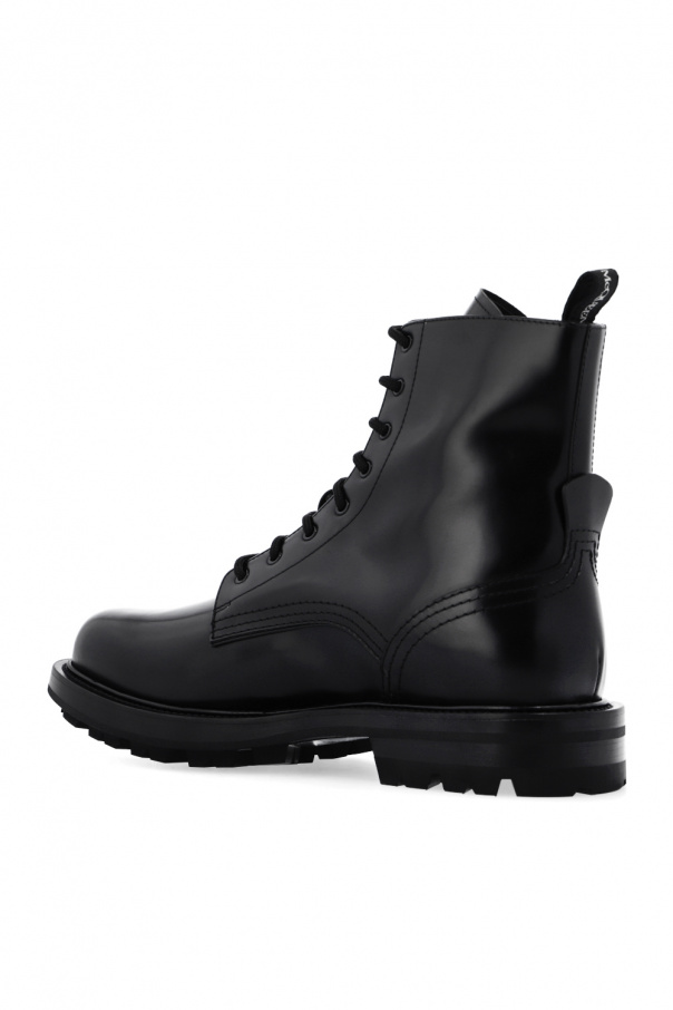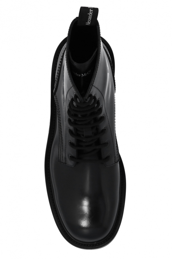 Black combat boots from Alexander McQueen. Crafted from leather, this model features a silver-tone logo printed on the tongue, a pair of additional lace and a black rubber sole.