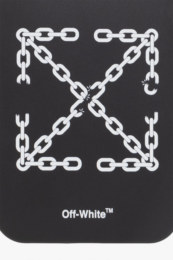 Black iPhone 13 Pro case from Off-White. This item is decorated with a chain print, logo and the brand’s signature arrows in white.