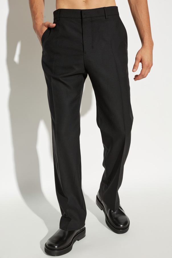 Experience the epitome of sartorial elegance with our exclusive Wool Trousers from the distinguished designer Ami Alexandre Mattiussi. Crafted from the finest quality wool, these trousers epitomize timeless sophistication and unparalleled comfort. Featuring a classic, straight fit, these trousers boast a minimalist, unembellished design, their smooth fabric exuding an air of understated luxury. The standard-length legs elegantly reach the ankles, ensuring a refined silhouette suitable for any occasion. The trousers come in a versatile black hue, enhancing their adaptability to both formal and casual ensembles. The front closure with a zipper and button, complemented by a standard waistband with belt loops, exemplifies thoughtful design. Two side pockets and two back pockets with buttoned flaps provide both functionality and a meticulous attention to detail. These trousers are a testament to the brand\'s heritage, founded in Paris in 2011 by Alexandre Mattiussi. AMI embodies the effortless, authentic spirit of Parisian fashion, merging casual ease with elegant sophistication. Why You Should Buy This Product Timeless, classic fit for an elegant look. Made from premium quality wool for comfort and durability. Versatile black color suitable for various styles. Meticulously crafted with attention to detail. Designed by award-winning designer Alexandre Mattiussi.