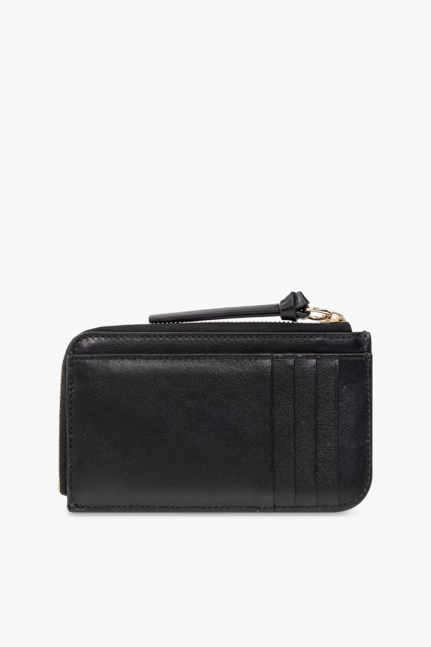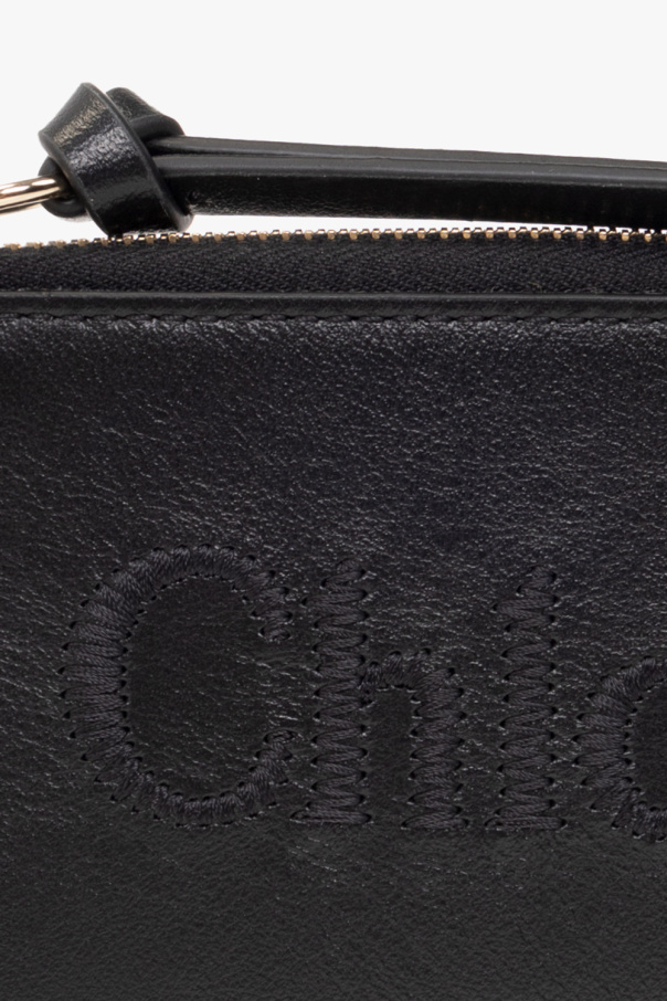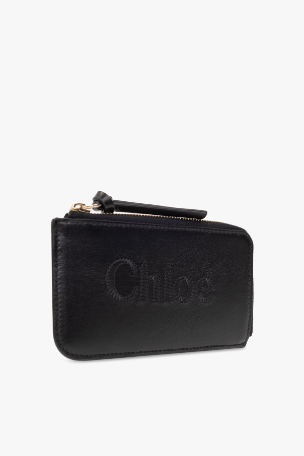 Black ‘Chloé Sense’ card holder from Chloé. Made of calf leather, this model features a logo embroidery, zipped coin pocket, slip pocket, four card slots and gold-tone metal hardware.