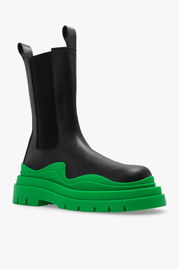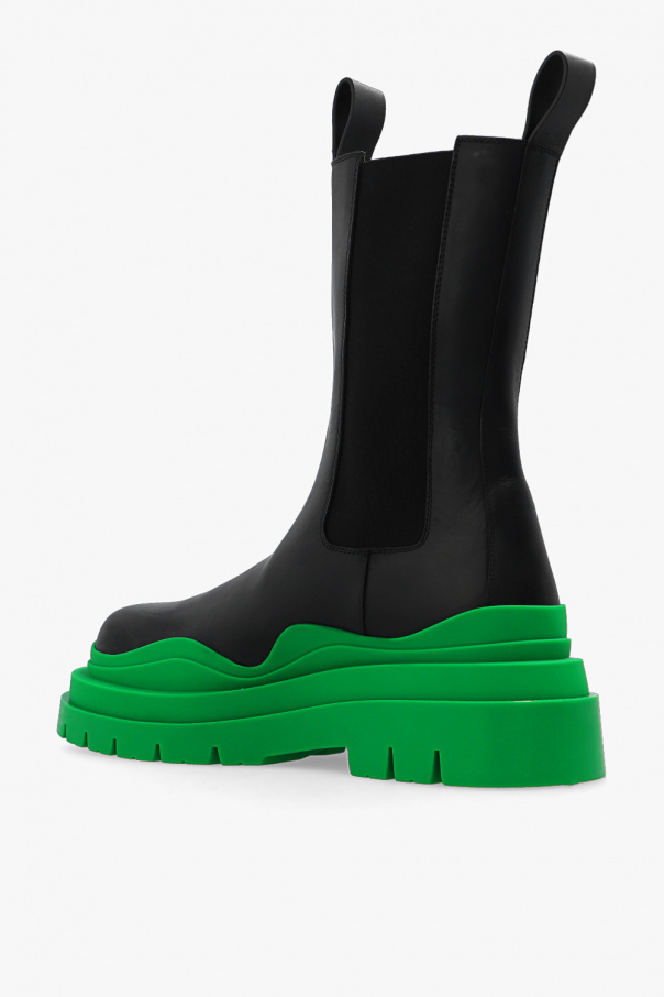 Black ‘Tire’ ankle boots from Bottega Veneta. Made from leather with a slip-on silhouette, this model sits on a green rubber sole and features elastic panels on the sides.