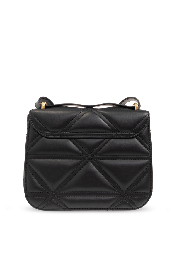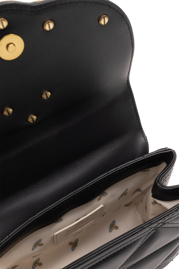 Black ‘Linda’ quilted shoulder bag from Vivienne Westwood. Made from leather, this design fastens via a snap and showcases a metal logo plaque on the front, gold-tone metal hardware as well as an adjustable shoulder strap and one internal compartment with a card slot.