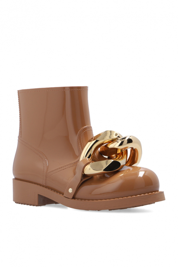 Light brown short rain boots from JW Anderson. Sitting on a blue rubber sole, this model showcases gold-tone chain link hardware on the front.