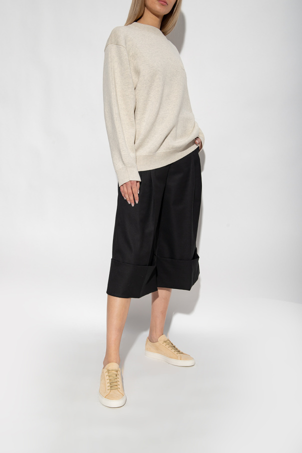 Cream ‘Original Achilles Low’ sneakers from Common Projects. Crafted from nubuck leather, this lace-up model sits on a white rubber and showcases a signature gold-tone serial number stamped on the side.