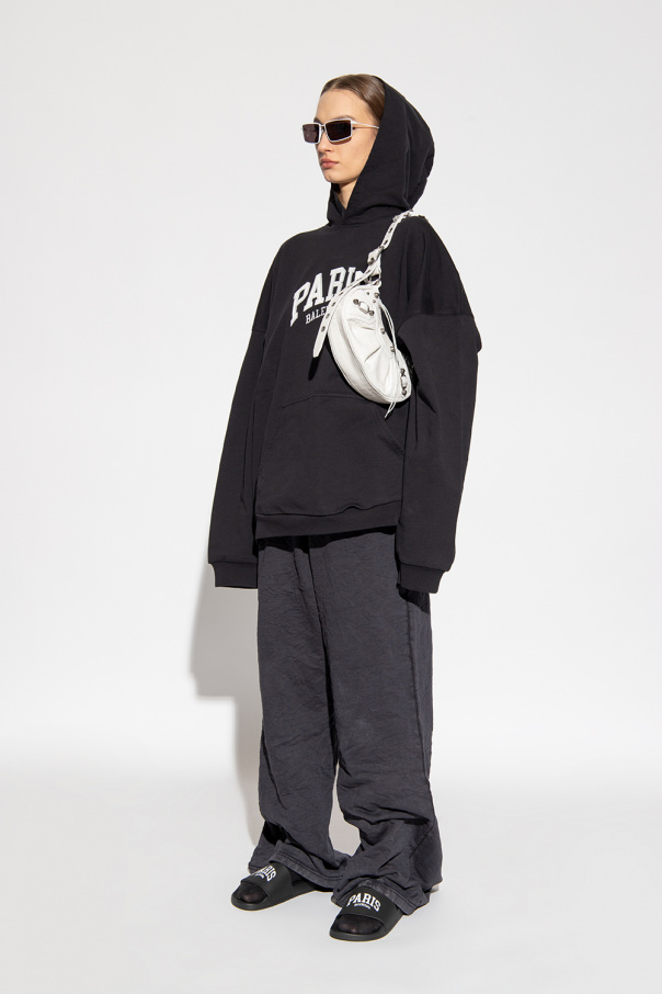 Black ‘Pool’ rubber slides from Balenciaga. Made of rubber, this pair is decorated with a white ‘PARIS BALENCIAGA’ print.