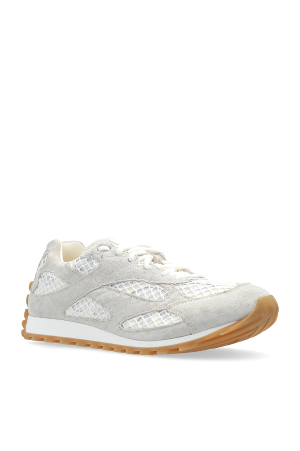 Introducing the epitome of casual sophistication—Bottega Veneta\'s Orbit sports shoes. These premium sneakers effortlessly blend timeless style with modern functionality, making them an impeccable choice for both everyday wear and light physical activities. Crafted with an exquisite combination of suede and mesh, the upper portion of these shoes offers unparalleled breathability and durability. The grey suede overlays seamlessly integrate with the white mesh panels, exuding an aura of understated elegance. Complementing this design is the light brown rubber outsole, which ensures superior grip and comfort with every step. The intricate details, such as the white laces and the distinctive designer logo on the insole and tongue tag, further accentuate the luxurious nature of these shoes. The Orbit’s classic low-top silhouette is versatile, effortlessly pairing with jeans and a white tee for a contemporary, stylish look. Why Choose This Product? Premium Materials: Superior suede, breathable mesh, and robust rubber outsole for maximum comfort and longevity. Elegant Design: A sophisticated blend of grey and white, perfect for any casual ensemble. Designer Appeal: Featuring the iconic Bottega Veneta logo, symbolizing luxury and quality. Versatility: Ideal for daily wear and light activities, seamlessly transitioning from casual outings to relaxed athletic endeavors.