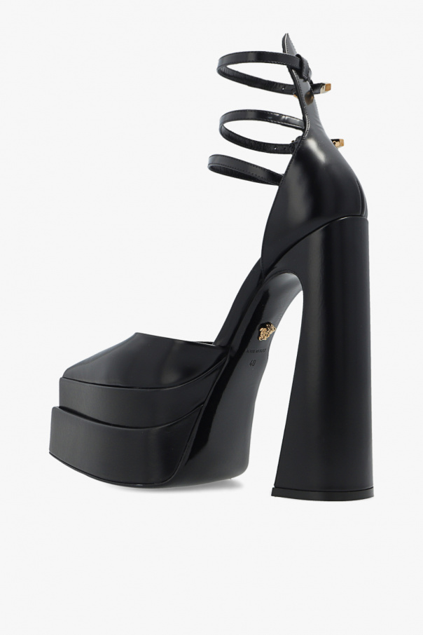 Black ‘Aevitas Pointy’ double-platform shoes from Versace. Crafted from patent leather, this model features a pointed toe silhouette, straps with gold-tone buckles and a black leather sole accentuated with a tactile Medusa.