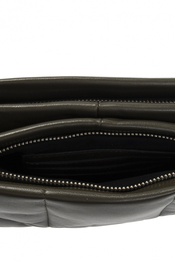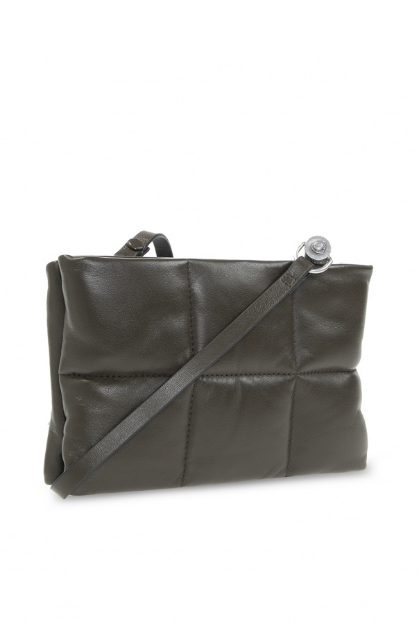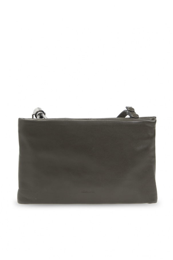Khaki ‘Mila’ quilted shoulder bag from AllSaints. Crafted from leather, this design secures with a metal zipper and showcases an embossed logo on the back, a detachable and adjustable shoulder strap, silver-tone metal hardware and a black cotton-clad interior with two zipped compartments with three card slots.