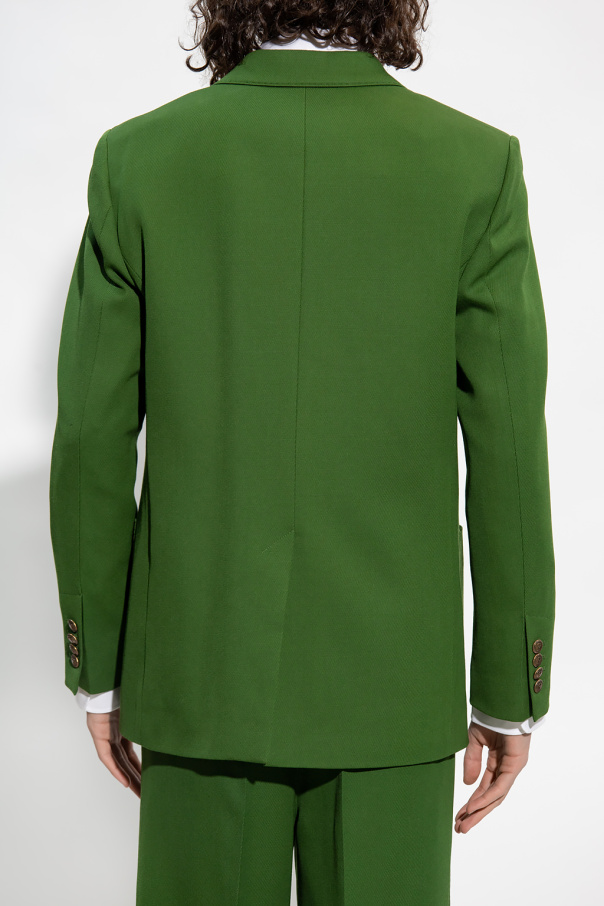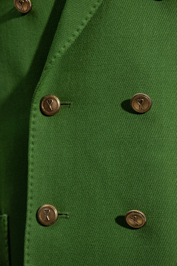 Short, green, double-breasted coat from Ami Alexandre Mattiussi. Made of virgin wool, this design features decorative logo buttons in gold-tone, peak lapels, three pockets, single rear vent and long sleeves with buttoned cuffs.