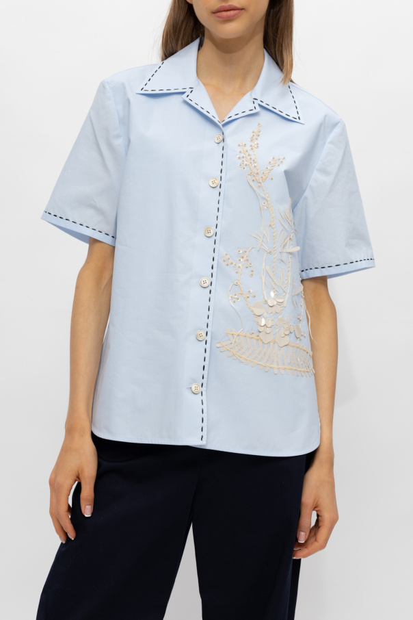 Light blue shirt with short sleeves from Tory Burch. Made of cotton, this garment features button fastenings, decorative sequin appliqués in black and contrasting black stitching at the collar, front and cuffs.
