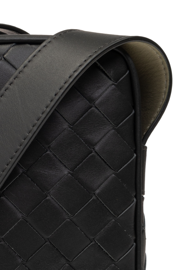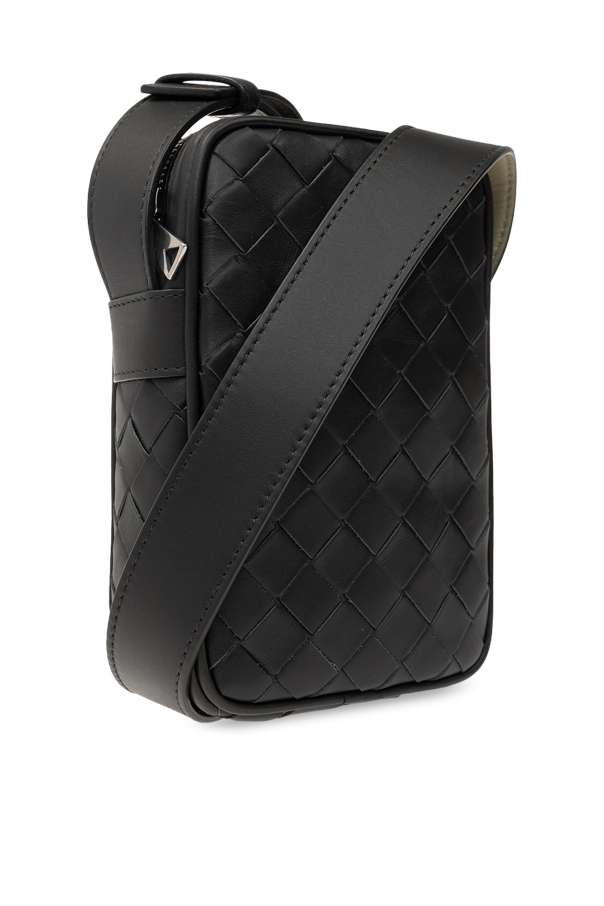 Dark green phone holder from Bottega Veneta. Crafted from calf leather accentuated with the brand\'s signature ‘Intrecciato’ weave, this design fastens with a zip and features an adjustable shoulder strap, silver-tone metal hardware and one internal compartment with three card slots.