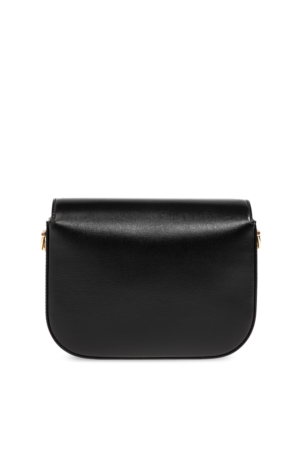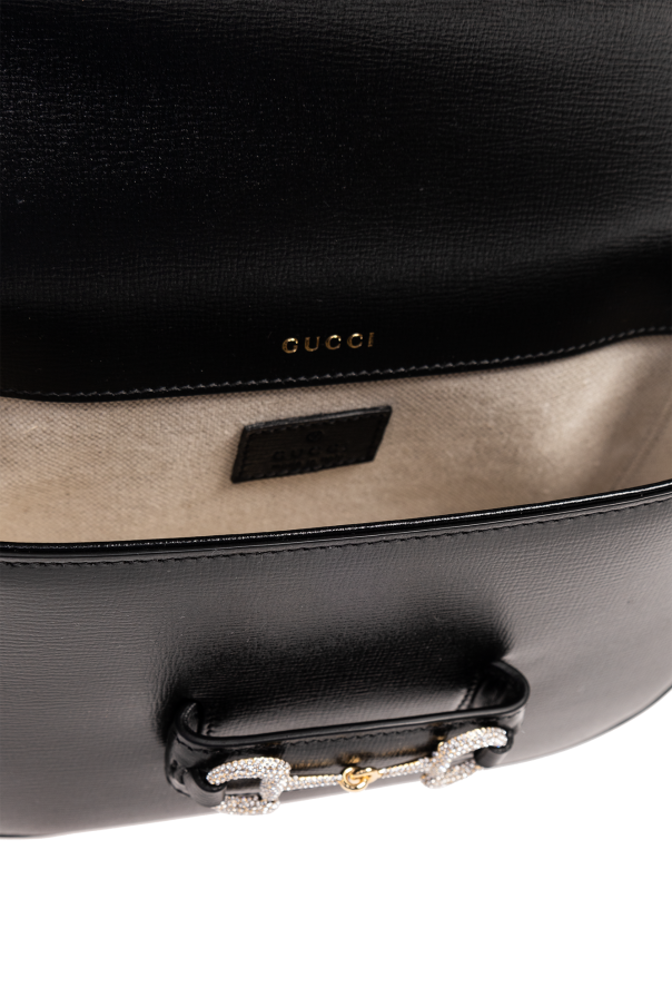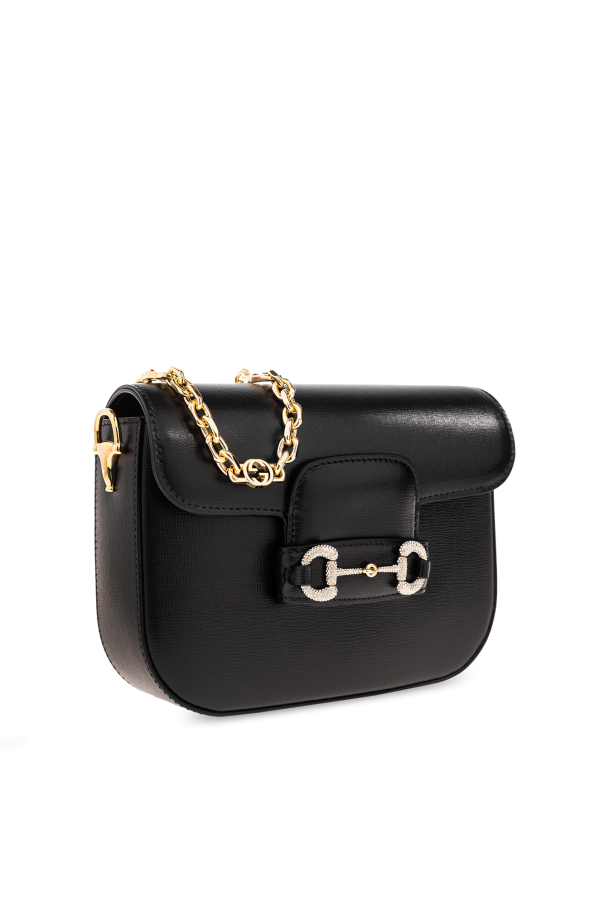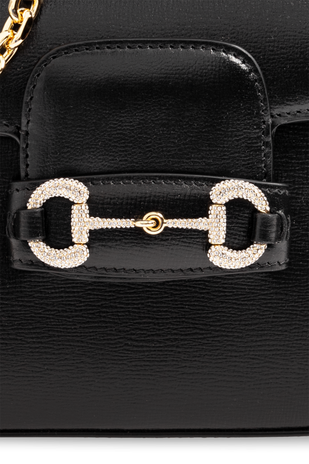 Black ‘1955 Horsebit Mini’ shoulder bag from Gucci. Made from calf leather, this design secures via a sliding fastener with a crystal-bejewelled horsebit and showcases a monogram pattern composed of sparkling appliqués. It is complete with a detachable chain shoulder strap, gold-tone metal elements and one internal compartment.