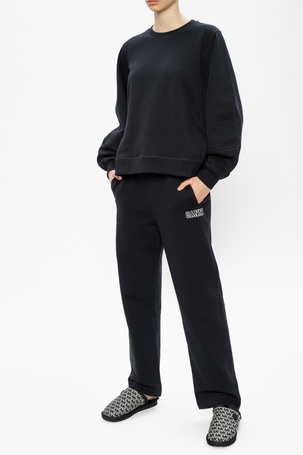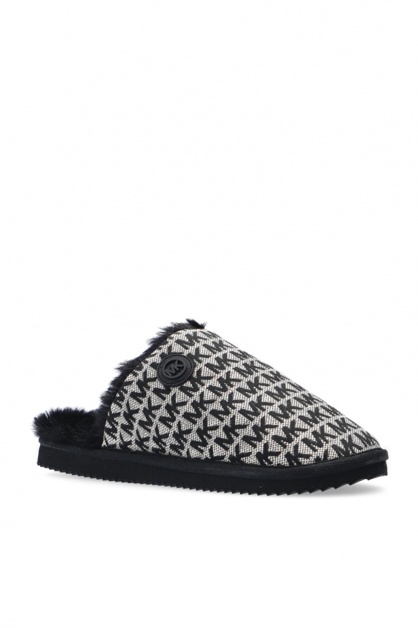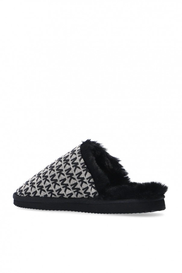 Black and beige ‘Janis’ slippers from Michael Michael Kors. Distinguished with embroidered motif and a rubberised detail with tactile logo, this pair is set on a black EVA foam sole and padded with synthetic fur.