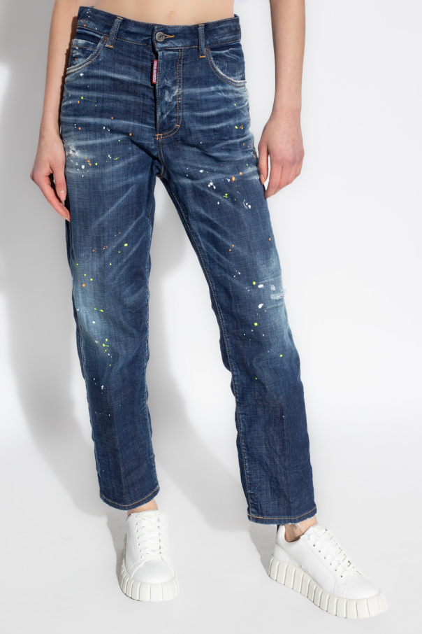 Blue ‘Boston’ jeans from Dsquared2. Made of cotton, this pair falls with tapered legs and features button closures, classic five pockets, paint splatters and a brown patch with an embossed logo.