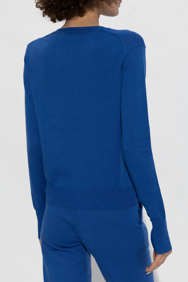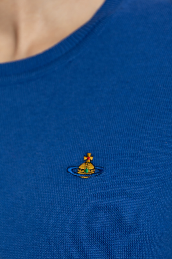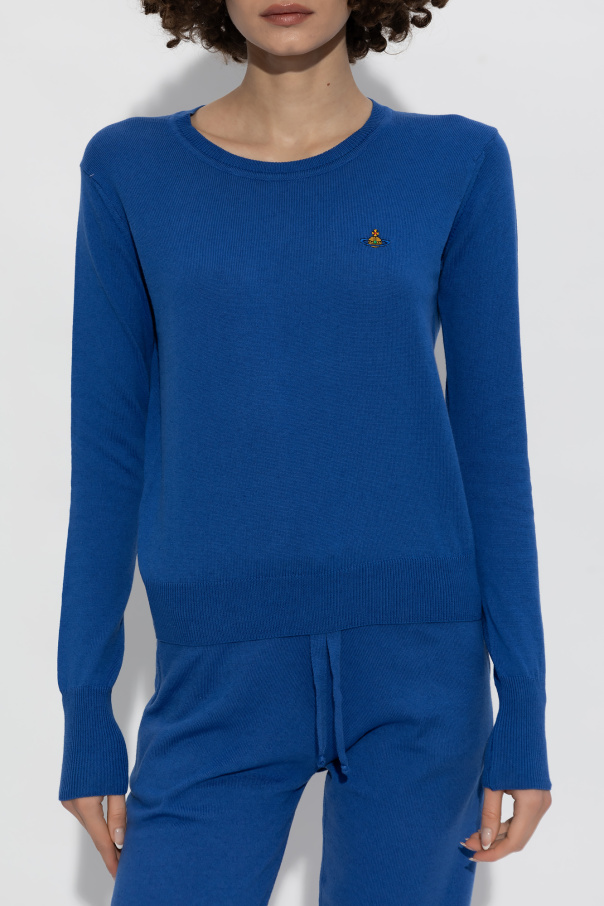 Dark blue ‘Bea’ sweater from Vivienne Westwood. Made from organic cotton with a touch of cashmere, this style showcases an embroidered colourful logo on the front, long sleeves and ribbed trims on the round neck, bottom hem and cuffs.