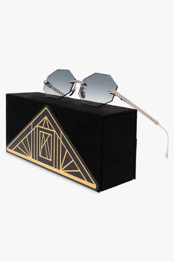 Silver-tone ‘Chain Nest’ sunglasses from Anna Karin Karlsson. Handmade in Japan from titanium, this model is plated with 24k gold and features a decorative frame wit ha single bridge, adjustable nose pads with a logo, chain detailing and blue gradient octangular lenses with anti-reflective coating, Zeiss technology and 100% UV protection. This limited edition design is produced in only 40 pieces worldwide. Individually numbered on the temples. Case included.