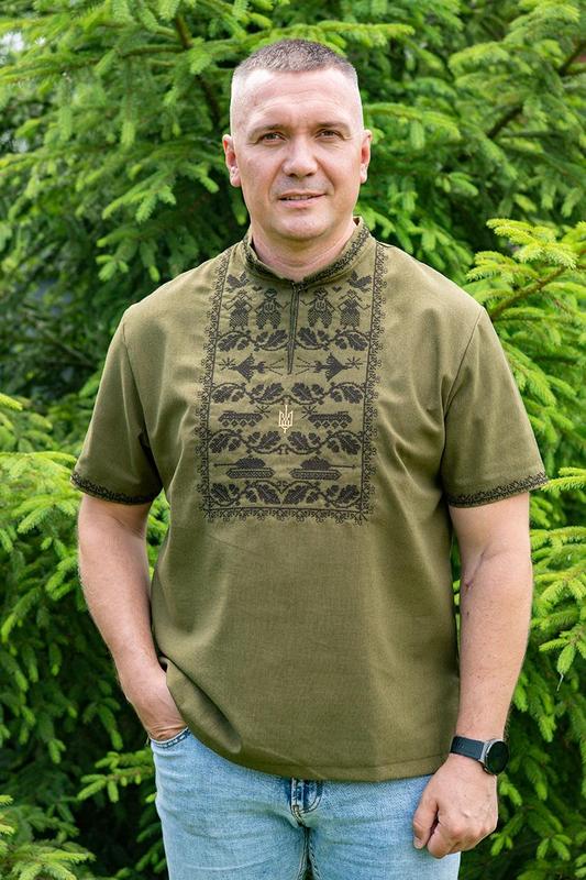 Универсальная. Ее можно надевать и для офисного помещения, и для прогулок, и для любых других случаев. Сочетается прекрасно с джинсами, шортами, брюками. Практичная. Неброский цвет, темная вышивка, простая в уходе ткань. Вышиванка немаркая, изделие не нужно стирать после каждой носки. Удобная. Очень удачный фасон вышиванки – широкий крой, свободный короткий рукав, стойка-воротник на пуговице. Легко в ней двигаться, быстро ее снимать и надевать.