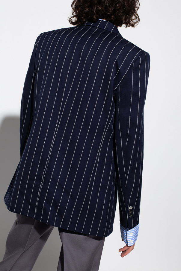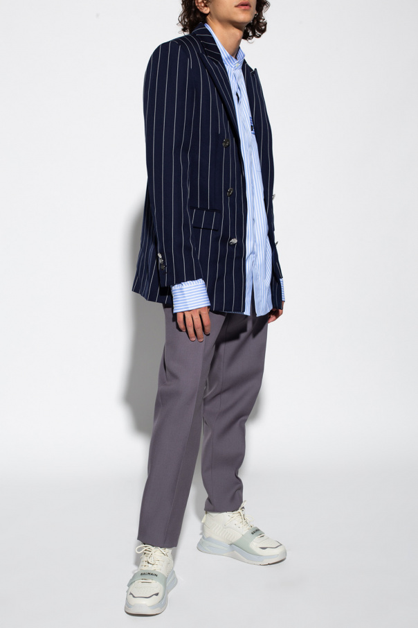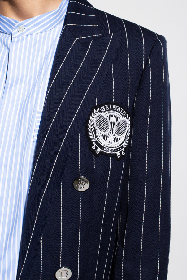 Navy and cream blazer with peak lapels from Balmain. Made of wool, this garment features decorative logo buttons in silver-tone, a stripe pattern, two flap pockets and a single rear vent.