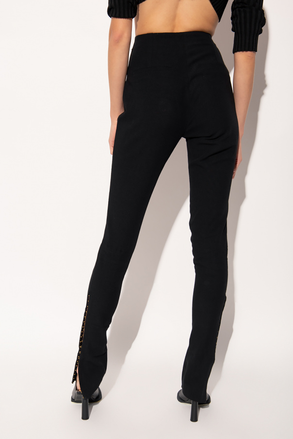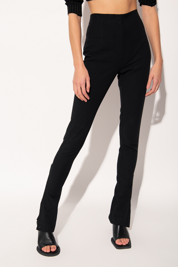 Black trousers from Jacquemus. Spun from a viscose and linen blend with a high-waisted silhouette, this pair features a zip fly with a button and snap hook, and tapered legs with slitted hems with hooks.