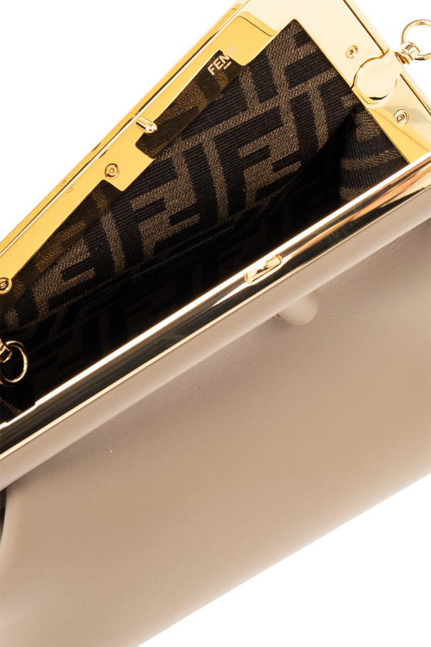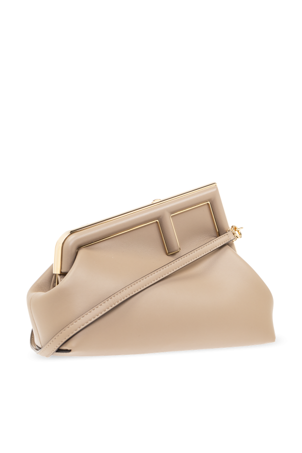 Beige ‘Fendi First Small’ shoulder bag from Fendi. Made of smooth leather, this design secures with a decorative ‘F’ snap and features a detachable and adjustable shoulder strap, gold-tone metal hardware and one internal compartment.