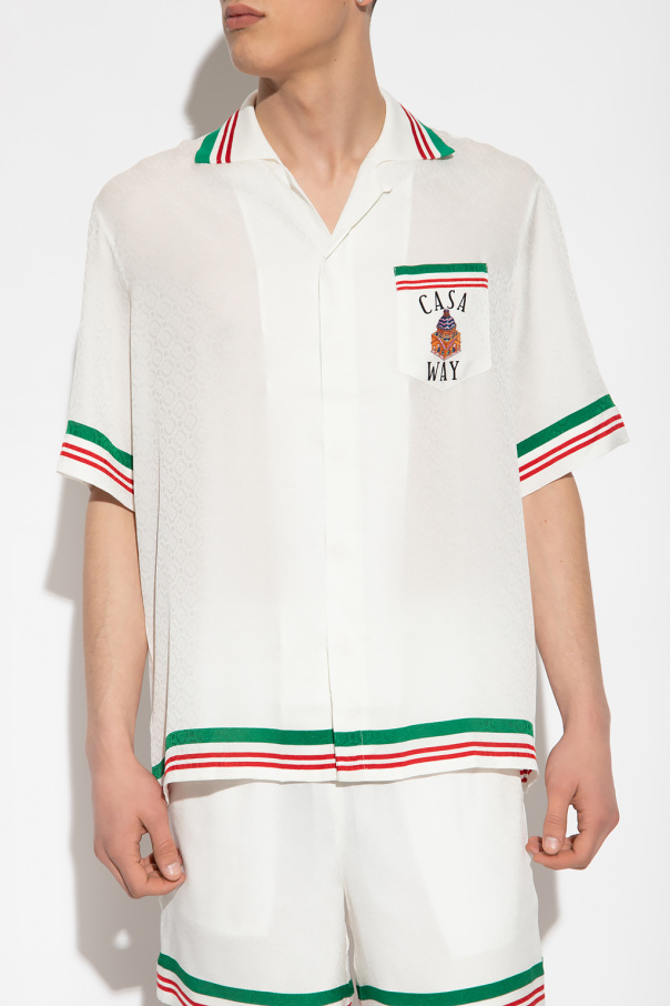White 'Casa Way' shirt from Casablanca. Made of silk, this style fastens with buttons and showcases a jacquard monogram pattern and colourful logo motif. It is complete with short sleeves.