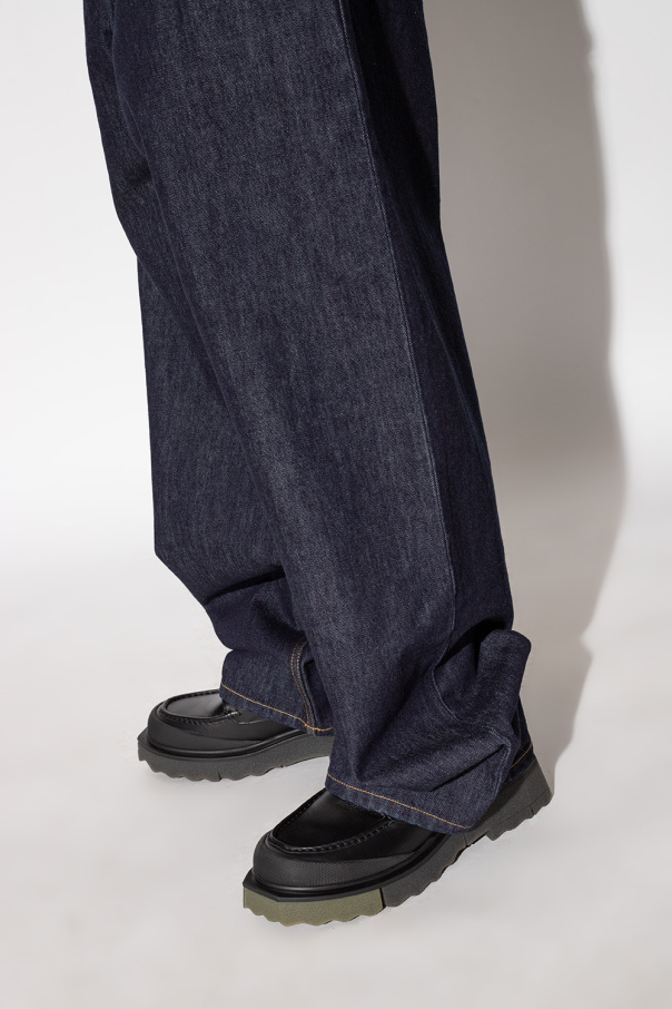 Black ‘Sponge’ Derby shoes from Off-White. Crafted from leather, this model sits on a black rubber sole and showcases a logo pattern.