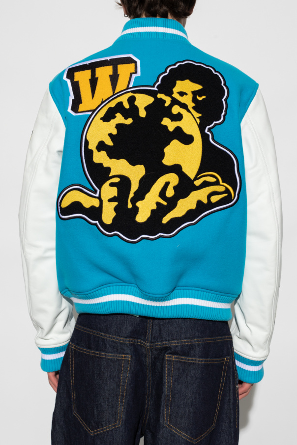 Multicoloured jacket from Off-White. Crafted from leather and wool, this style fastens with snaps and showcases a logo pattern. It is complete with two welt pockets and elasticized trims on the standing collar, bottom hem and cuffs.