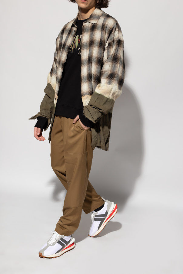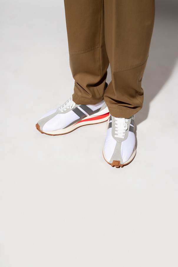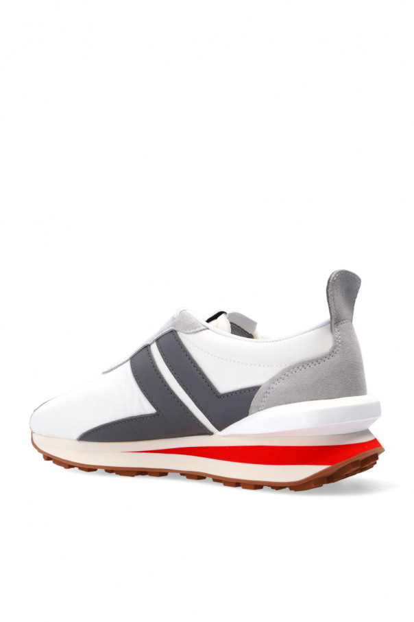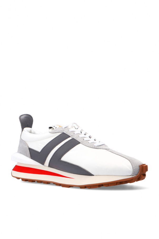 Grey and white sneakers from Lanvin. Crafted from suede and calf leather overlays on a textile upper, this lace-up pair sits on a cream and brown rubber sole and features a logo-embroidered tongue patch.