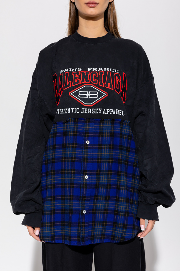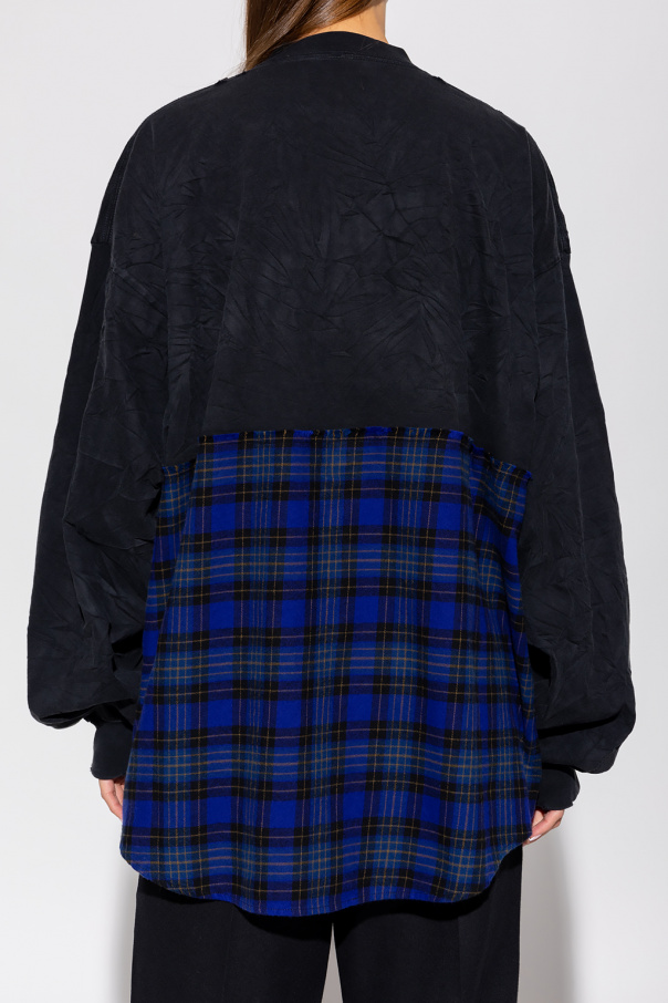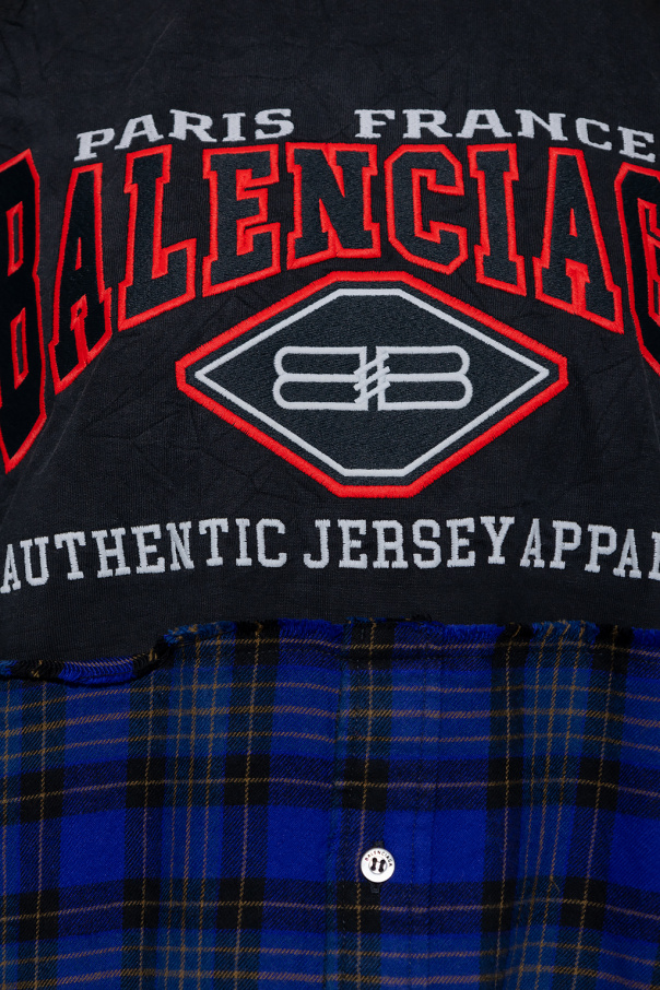 Black and dark purple crewneck T-shirt from Balenciaga. The upper part is made of crinkled cotton jersey and showcases a black, white and red ‘Maison Balenciaga’ logo on the front, a jagged collar, elasticized trims and vintage and washed treatment. The bottom part is made of black and yellow check flannel and has button fastenings.