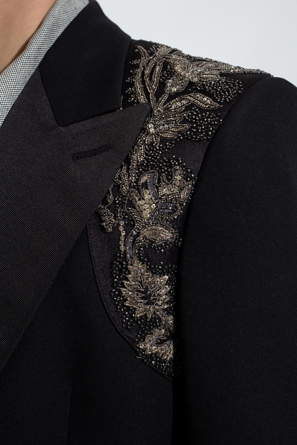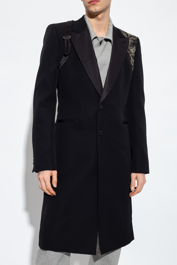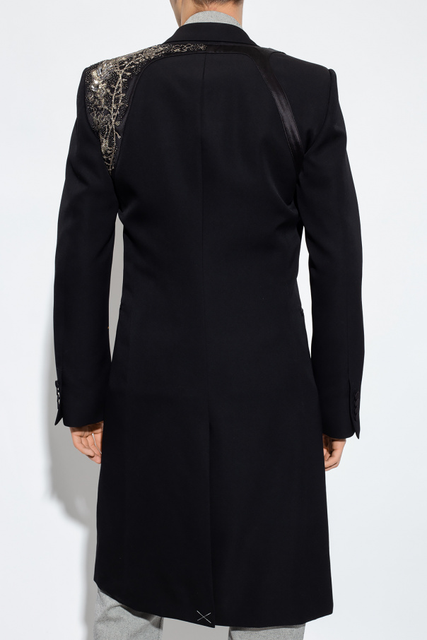 Black coat from Alexander McQueen. Made of wool, this style fastens via buttons and showcases application embroidered with a glistening thread, sequins, beads and gold-tone, silver-tone and black mesh trims. It is complete with peak lapels and long sleeves with button cuffs.