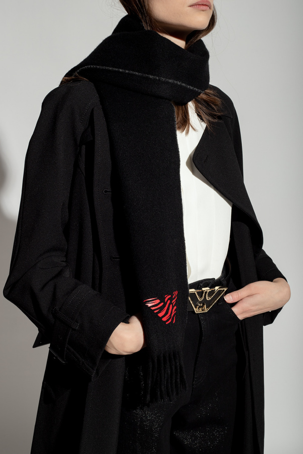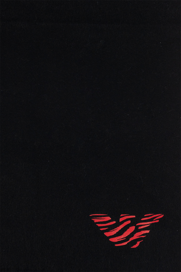 Black and grey scarf from Emporio Armani. Made of cashmere, this item showcases a printed pattern and the brand\'s logo in red and fringe detailing.