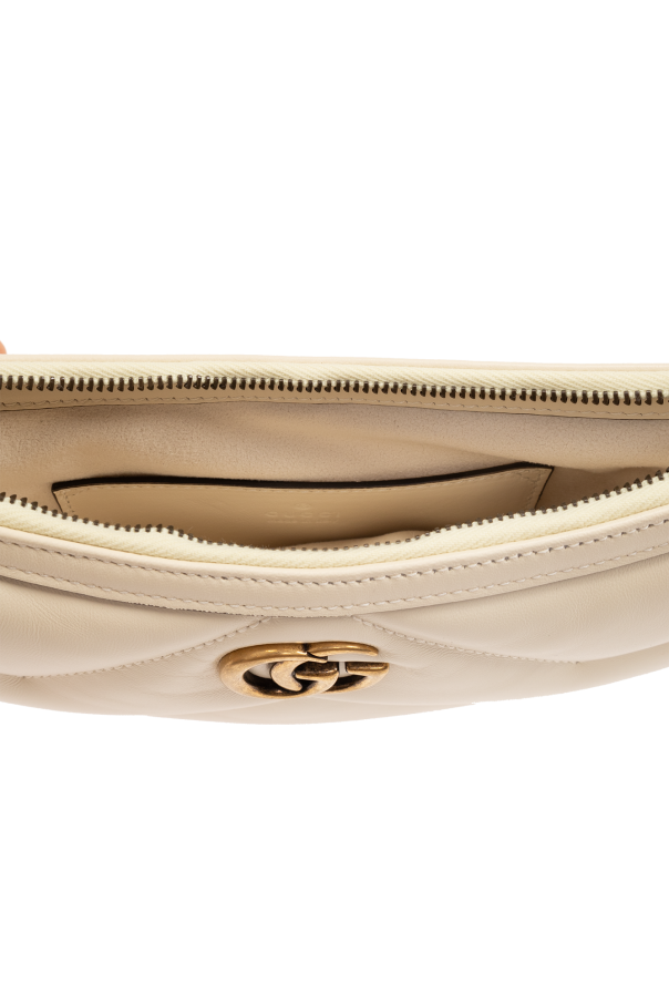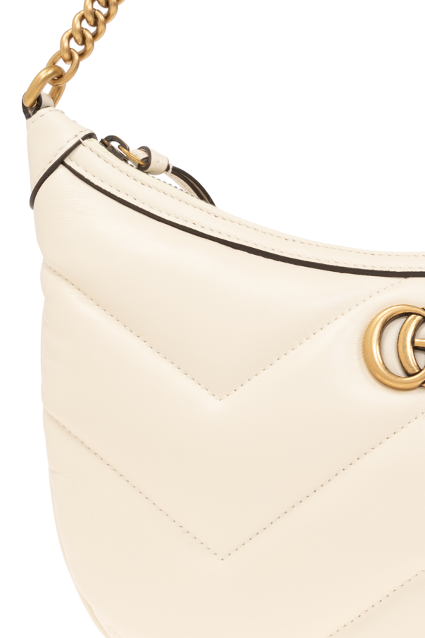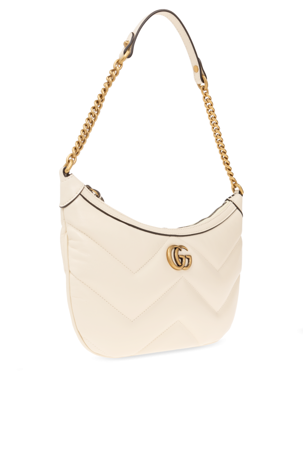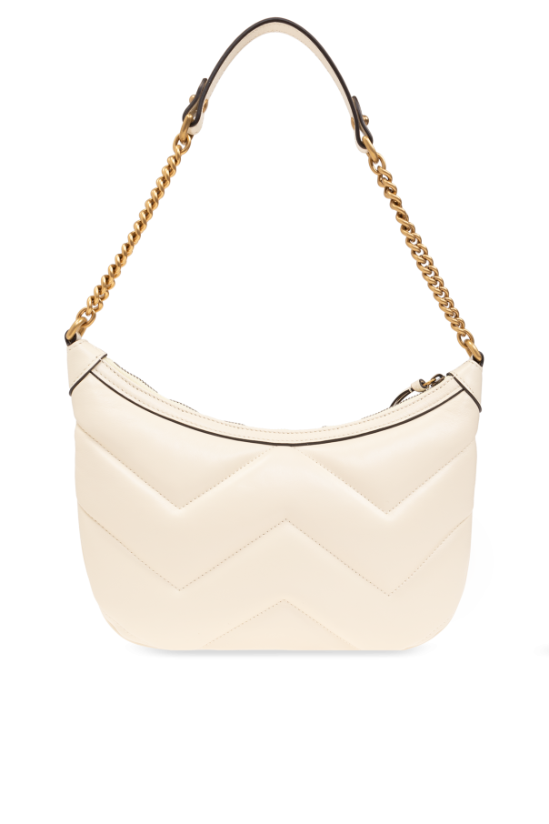 Cream ‘GG Marmont Small’ quilted shoulder bag from Gucci. Made of lamb leather, this design features a zip fastening, shoulder strap with chain inserts, metal Double G logo, antique gold-tone metal hardware and one internal compartment with one slip pocket.