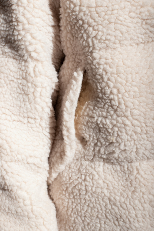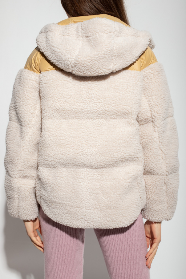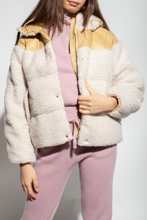Cream and yellow jacket with a hood from Rag & Bone. Made of faux-shearling with an oversize silhouette, this style fastens via a zipper and snaps and features two snap-fastened flap pockets on the front, snap closures on the sides and long sleeves with elasticated cuffs.