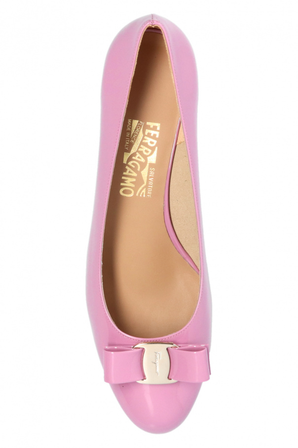 Pink ‘Vara’ heeled pumps from Salvatore Ferragamo. Made of patent leather, this model features a bow-shaped buckle with a logo and a beige leather sole.