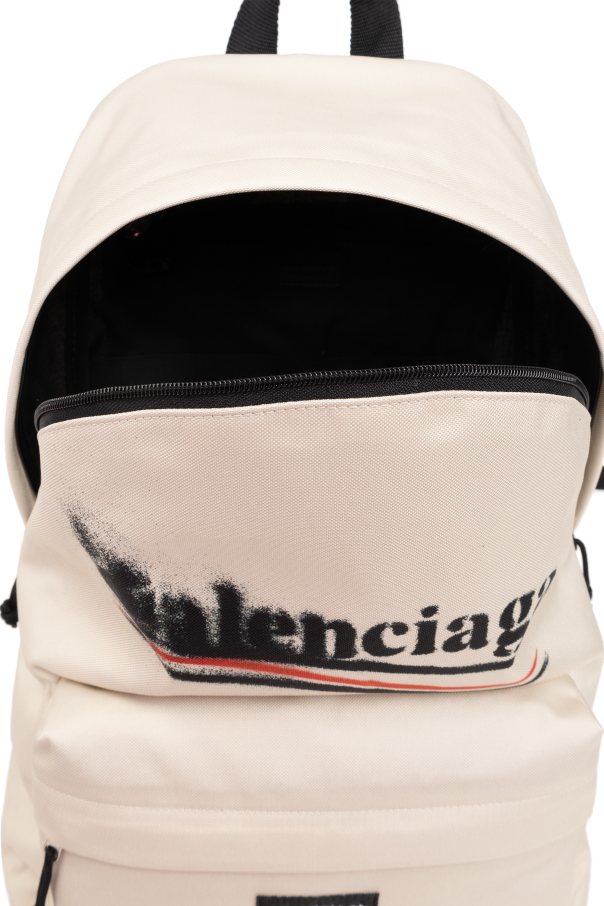 Introducing the Balenciaga Logo Backpack, a masterpiece of minimalist design blended with modern flair, ideal for the discerning fashion enthusiast. Crafted from premium materials, this cream-colored backpack embodies both durability and timeless elegance. Its classic, streamlined silhouette with a rounded top and vertical orientation offers a sophisticated take on the traditional backpack, making it a versatile accessory for any wardrobe. The backpack features a single main compartment and a front zip pocket, allowing for efficient organization of essentials. The distinctive logo on the front, rendered in black with a striking red and black smeared paint effect, adds a contemporary edge to the piece, signifying the Balenciaga brand\'s commitment to innovative, high-fashion design. Additionally, the backpack is equipped with adjustable, wide black shoulder straps and a top handle, ensuring comfort and ease of carrying. Further emphasizing its exclusive appeal, a subtle rectangular black panel bearing the brand\'s name adorns the lower part of the front pocket, serving as a hallmark of authenticity and luxury. The backpack\'s closure system is thoughtfully designed with a dual-direction zipper, enhancing its functionality. Inside, it houses a zippered pocket and a slip pocket, providing secure and accessible storage options for personal items. Why Purchase This Product? Elegantly crafted from 100% high-quality material for longevity and style. Modern and distinctive design with the iconic Balenciaga logo for brand enthusiasts. Functional layout with a main compartment and additional pockets for organized storage. Adjustable shoulder straps and top handle for comfortable wear and easy handling. Exclusive detail with the brand name panel, enhancing its luxurious appeal.