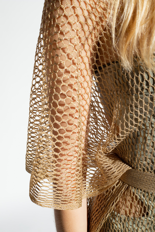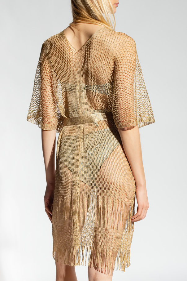 Gold-tone ‘Pie’ openwork poncho from Pain de Sucre. This V-neck design is enriched by fringes and comes with a belt.