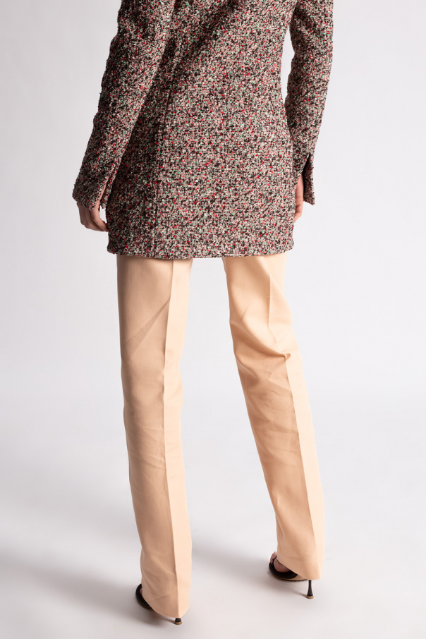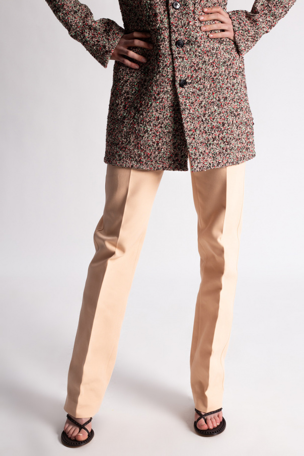 Beige pleat-front trousers from Bottega Veneta. Crafted from cotton, this pair falls to tapered legs and features a zip fly, a hook & eye closure, two slip pockets on the front and two flapped pockets at the back.