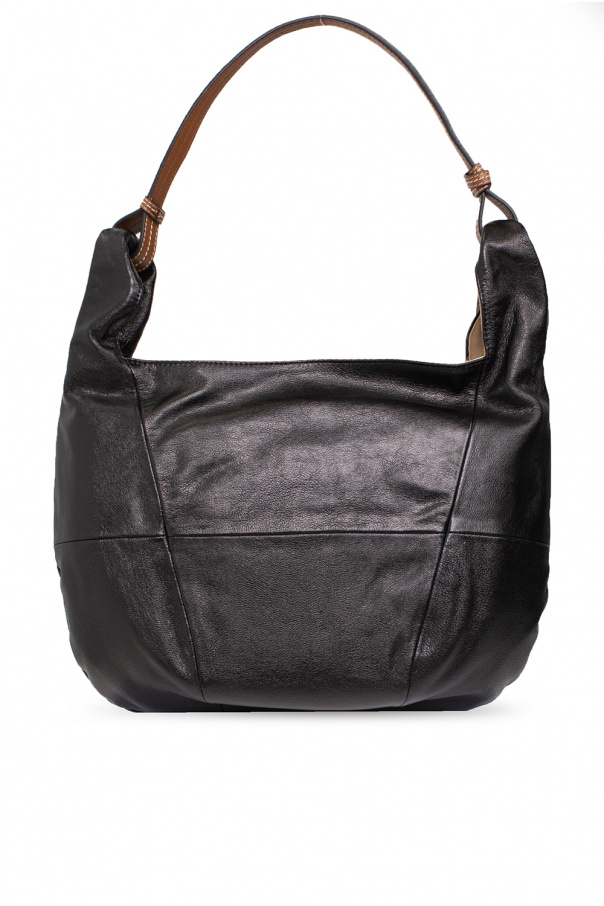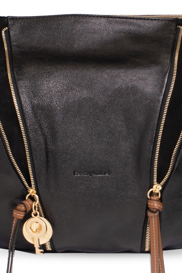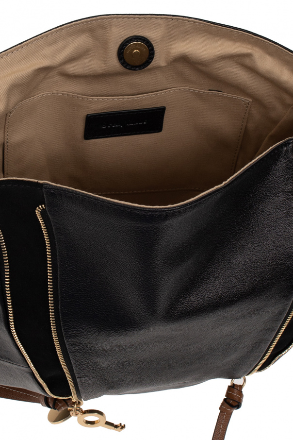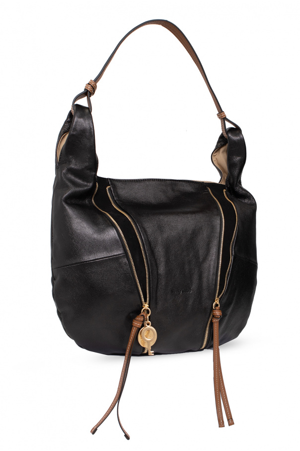 Black ‘Indra’ hobo shoulder bag from See By Chloé. Crafted from leather, this design secures with a snap and showcases an embossed logo and decorative zips with tassels and metal logo charms on the front, a half-round handle in brown, gold-tone metal hardware and one internal compartment with a slip pocket.