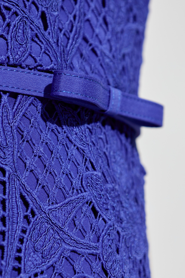 Introducing an exquisite piece from the renowned designer, Self Portrait, this lace midi dress epitomizes elegance and sophistication. Crafted from the finest polyester, its intricate, lattice-like pattern weaves a narrative of delicate beauty throughout the garment. The dress\'s luscious purple-blue hue enchants the eye, making it a stunning selection for those seeking a garment that truly stands out. Boasting long sleeves and ending just above the ankles, this dress is a testament to refined style. Its round neckline is complemented by a tasteful cutout at the back, secured with a button, adding a touch of allure. The inclusion of a belt, fashioned from the same opulent material and color, accentuates the waist, lending structure and highlighting the silhouette. Devoid of any visible branding or logos on its exterior, this piece speaks volumes of the brand\'s discretion and elegance. It is a dress that transcends mere fashion to become a statement of grace, ideal for weddings, receptions, and other ceremonial occasions. Why Purchase This Dress? Exclusive design by Self Portrait, a symbol of luxury and high fashion. Exquisite lattice pattern and fabric texture, offering an unparalleled level of detail and sophistication. Versatile for special occasions, ensuring you are the epitome of elegance. Elegantly accentuates the body shape with a fitted belt, enhancing your natural silhouette. Subtle back cutout with button closure adds an element of intrigue and refinement.