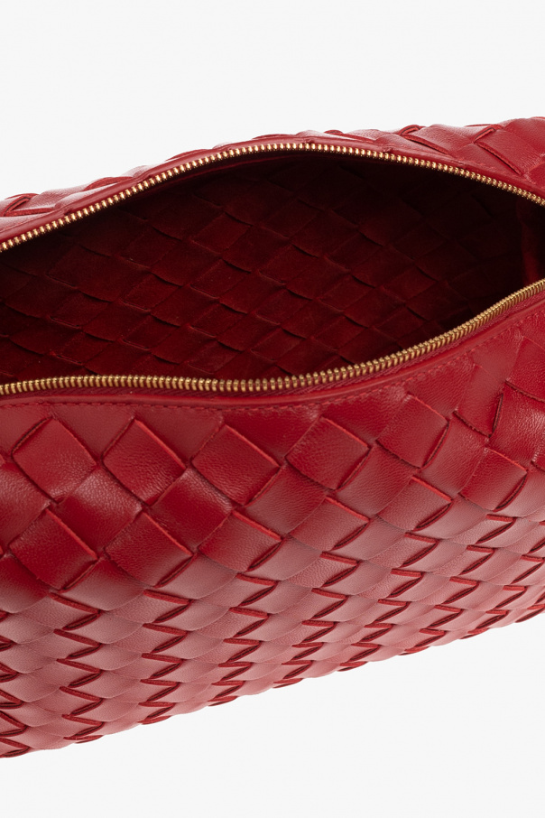 Red ‘Loop Small’ shoulder bag from Bottega Veneta. Crafted from lamb leather with the brand\'s signature ‘Intrecciato’ weave, this design features a two-way zip fastening, a double shoulder strap accentuated with decorative knots, gold-tone metal hardware and a suede-clad interior.