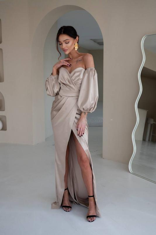 Сроки отправки 2-5 днейВ этом платье отлично все. Объемные рукава, которые можно снять. Когда в одном платье соединились роскошная ткань, корсетный верх в виде сердца, шлейф и разрез от бедра – выходит настоящий шедевр.