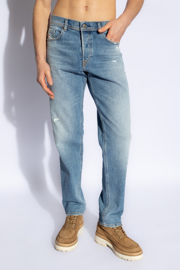 Blue ‘2023 D-FINITIVE’ jeans with a vintage effect from Diesel. Fastened with buttons, this regular fit pair features a logo tag, three front pockets, two back pockets and a vintage effect.