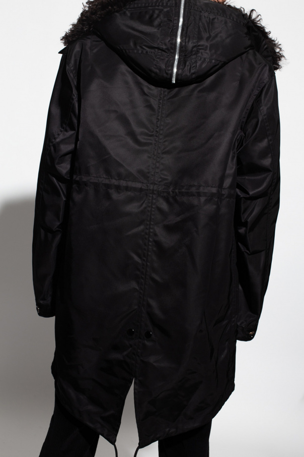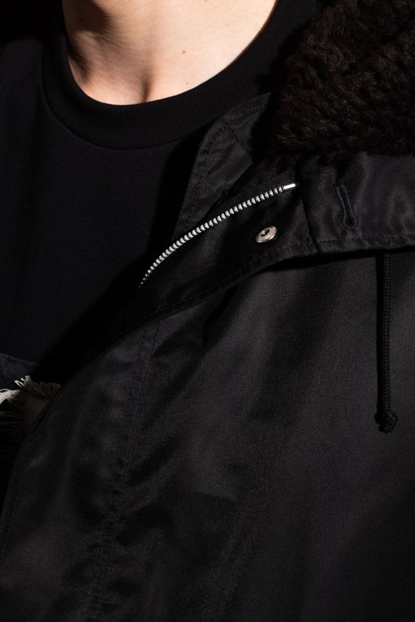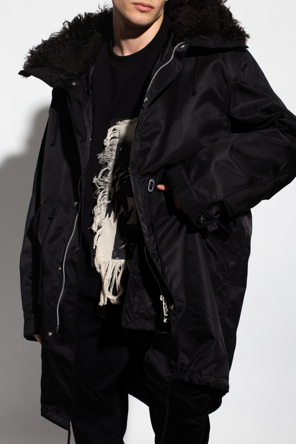 Black parka from Bottega Veneta. Fastened with a two-way zip, buttons and snaps with a concealed placket, this garment features a drawstring waist, two flap pockets, hood with brown lamb fur, long sleeves with button cuffs, asymmetrical drawstring hem and detachable lamb fur lining.