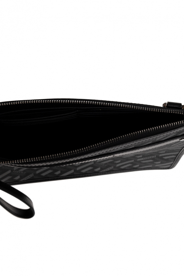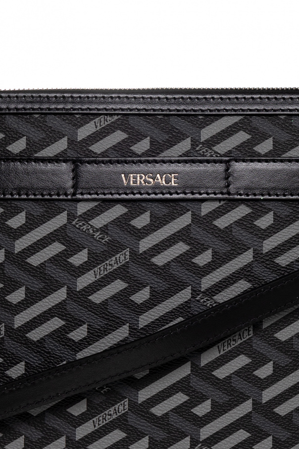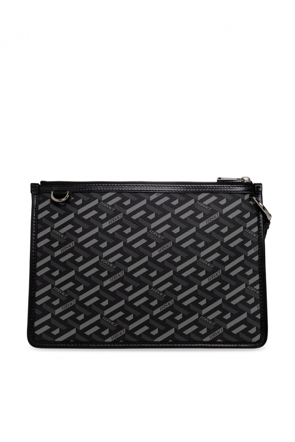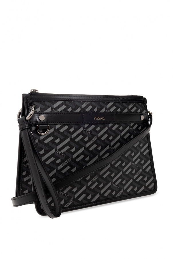 Black and grey shoulder bag from Versace. Crafted from from canvas embellished with the brand's signature La Greca pattern, this design features a zip fastening, calf leather trims, a logo print on the side, a a detachable wrist strap on the side, grey metal hardware and one internal compartment with ten card slots.